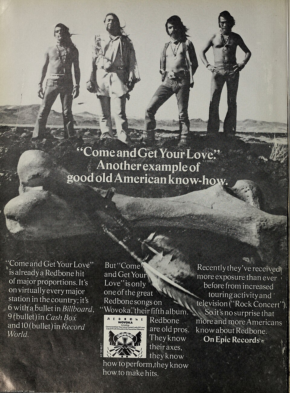 Cropped upper part of the 1974 advert for Redbone’s legendary hit single Come and Get Your Love released through Epic Records. Image source: Wikimedia Commons (via Cash Box magazine)